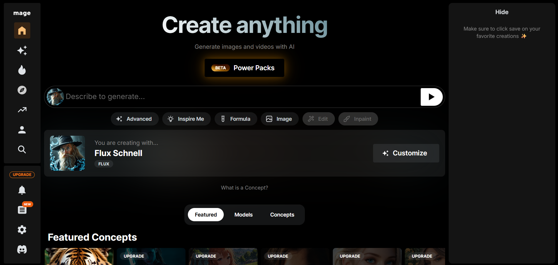 Mage.space enables you to generate images and videos with features like LoRA, ControlNet, upscaling, negative prompt control, privacy, and many other features.