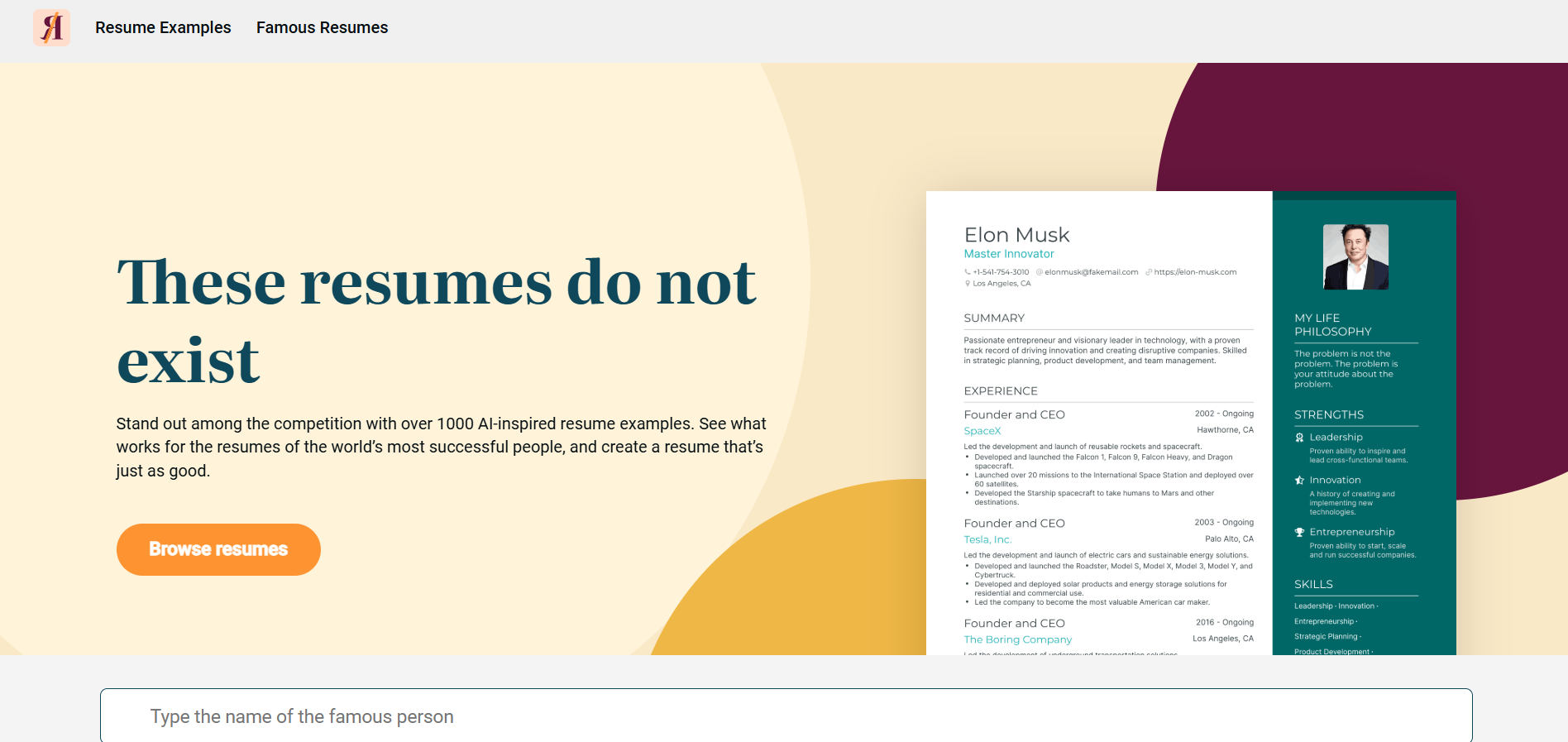 This Resume Does Not Exist uses AI technology to construct unreal resumes for celebrities, acknowledged personalities, eminent historical individuals, and much more. The resumes provided serve as cases based on the achievements and endeavors of famous people.