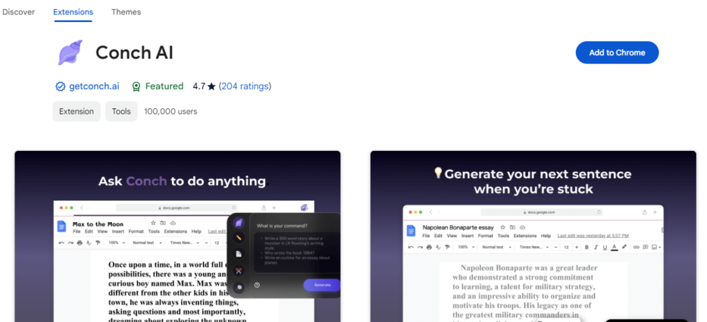 Conch AI has many wonderful features that let it rewrite phrases, summarize the content, generate quotes, and even answer queries. Moreover, Conch AI is versatile in content creation by working with many applications such as Gmail and Google Docs via the Chrome app.