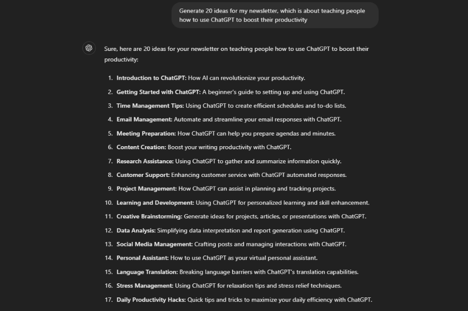 From what I have experienced, AI can be incredibly useful for brainstorming blog content ideas, as well as for social Media Management Software. Stop wasting hours coming up with ideas, and use an AI chatbot to kickstart your creativity. Provide it with a relevant broad topic or keyword and wait for the results. For example, if you write about travel, you could say: “Generate 20 ideas for my newsletter, which is about teaching people how to use ChatGPT to boost their productivity.” And here’s the response I received: