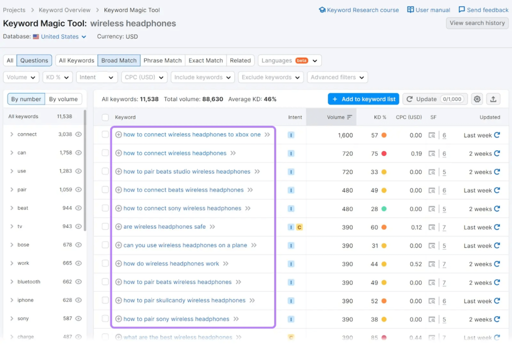 For example, I researched the keyword “wireless headphones.” on Semrush and will get a list of related keywords as below: